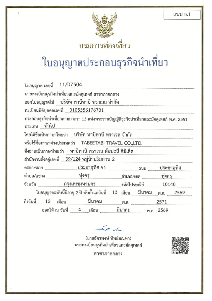 บริษัท ทาบีทาบิ ทราเวล จำกัด ใบอนุญาตเปิดบริษัท เลขที่ 11/07504 เป็นบริษัท ที่เริ่มต้นธุรกิจด้วยใจที่รักในงานบริการ และงานธุรกิจท่องเที่ยว เราเคยร่วมงานกับบริษัทในยุคบุกเบิกได้เรียนรู้จุดอ่อนและจุดแข็ง จนมีประสบการณ์ มีความชำนาญ ในการบริหารจัดการธุรกิจ การท่องเที่ยว ไม่ว่าจะเป็นในประเทศหรือต่างประเทศ เราเป็นบริษัทที่มีความมุ่งมั่นรักษาคุณภาพ และมาตรฐาน ที่จัดสรรเพื่อลูกค้าและนักท่องเที่ยว ด้วยการรักษาคุณภาพด้านความซื่อตรงที่มีต่อลูกค้า ไม่ว่าจะเป็นเรื่องของราคา และความคุ้มค่า รวมถึงด้านการให้บริการที่ประทับใจ มีเป้าหมายสำคัญคือทำให้ผู้เดินทางมีความสุขทุกครั้งที่ได้เดินทางกับเรา